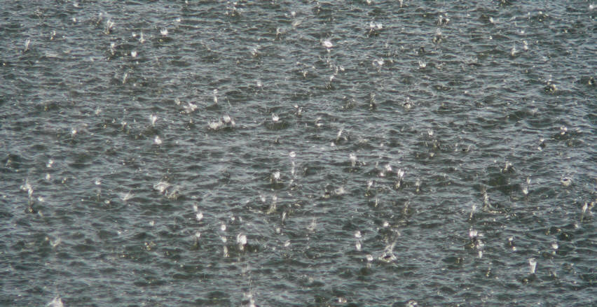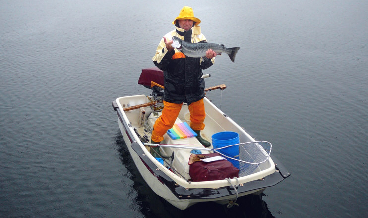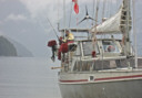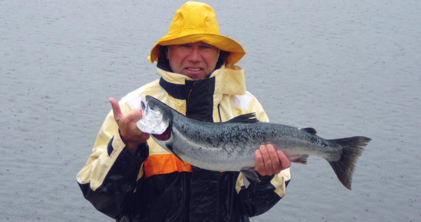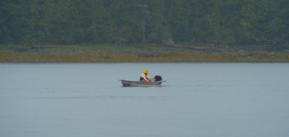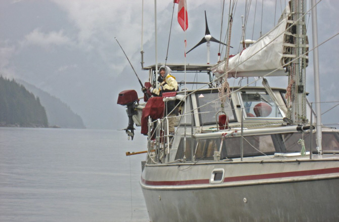 Beim Herfahren, etwas ausserhalb und auf der anderen Seite der Bucht, sah ich tags zuvor einige Sportfischer am Angeln. Also sollte es doch auch hier, direkt vor unserem Ankerplatz, Lachse geben. Trotz strömendem Regen hielt mich nun nichts mehr zurück und ich sattelte unser kleines Dinghi. Der improvisierte „Downrigger“ kam wiederum zum Einsatz und das Jagdfieber nahm mich vollends in seinen Griff. Die kleine Pütz (Wassereimer) hatte Hochbetrieb, denn es schüttete echt von oben und trotzdem stand im Dinghi das Wasser immer ca. 5 cm hoch.